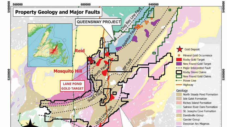 Rocky Shore Gold is a Canadian junior exploration company targeting the expansion of its two porphyry-controlled Mosquito Hill and Reid Gold Deposits and the discovery of structurally controlled high-grade gold zones at its 100%-owned Gold Anchor Project. The project is strategically located in central Newfoundland - hosting one of Canada's most promising and underexplored gold belts. The district-scale project is the second-largest property (greater than 1,200 square kilometres) within an emerging gold district. The Gold Anchor Project is on trend to major gold discoveries and recent gold deposits northeast of the Gold Anchor Project associated with the highly prospective Appleton and JBP Faults. For more information, please visit our website at www.rockyshoregold.com.
