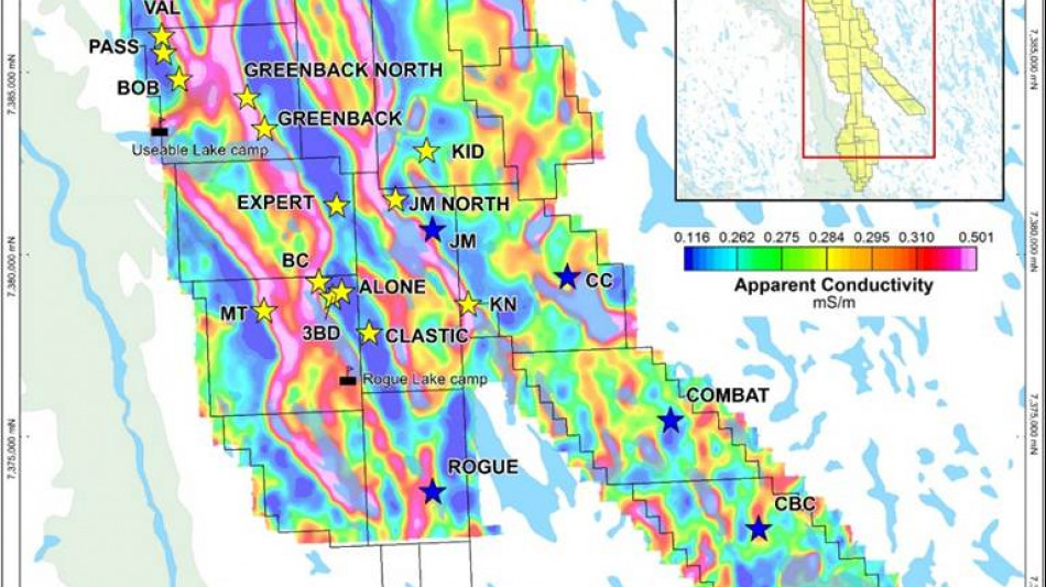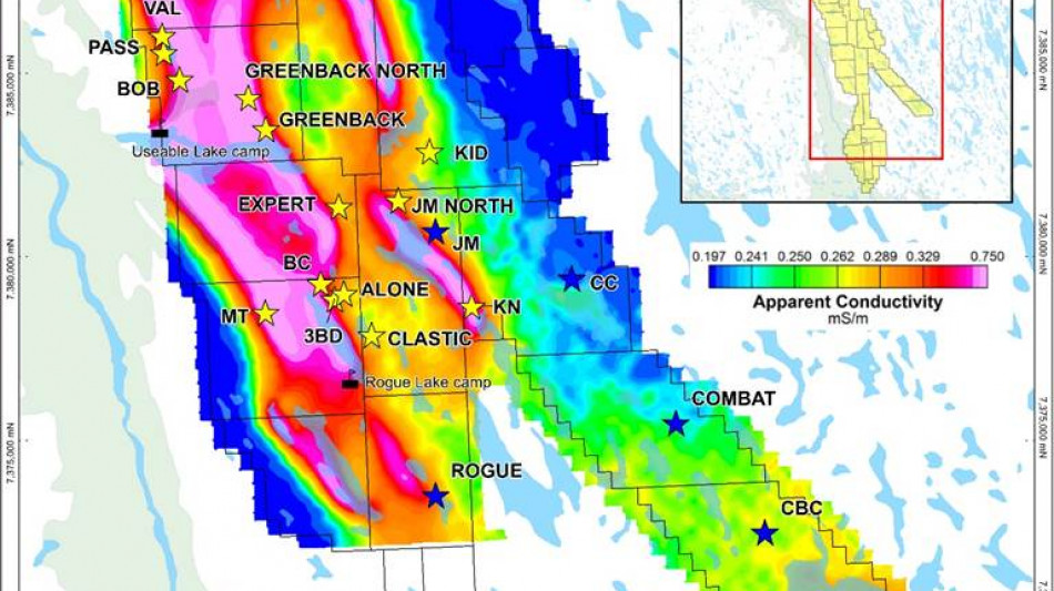 Many of the major new showings show good spatial correlation with both low- and high-frequency conductors. Expert, Alone, and Clastic are more marginal to the conductors, but their location is on the east margin of a syncline that dips towards the conductors. Most showings also occur along or proximal to the Rocknest-Odjick contact, as has been observed elsewhere on the Property.