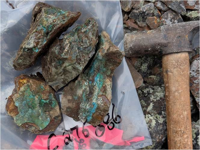 Figure 4: Quartzite boulders with disseminated chalcopyrite-bornite at the Clastic Showing, up to 3.7% Cu and 2.08 g/t Au.