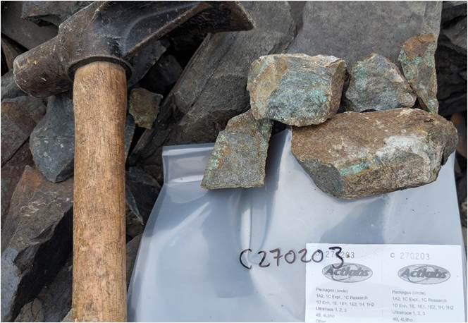 Copper-gold mineralization identified, with assays up to 5.42% Cu and 1.89 g/t Au and 3.73% Cu with 2.08 g/t Au in disseminated sediment-hosted styles of mineralization