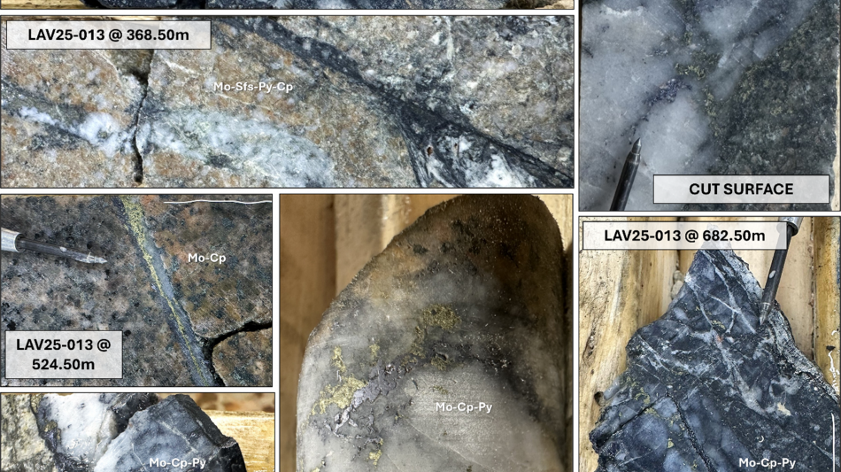 LAV25-013 was collared 280 metres northwest of drillholes LAV25-011 and 010 into an intensely hematite±biotite±magnetite altered phase of the Laverdiere Porphyry. This zone contains high epithermal and molybdenite-pyrite-dominant porphyry vein densities that persist to approximately 515 metres drilled depth. Near 350 metres depth, chalcopyrite content increases in porphyry veining with spotty bornite within narrow, well-developed zones of variably altered porphyry. These mineralized zones were drilled intermittently to drilled depths exceeding 1,050 metres, alternating with zones of late-to-post-mineral porphyry.