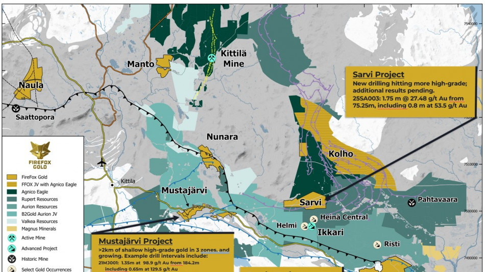 SODANKYLÄ, FINLAND / ACCESS Newswire / January 21, 2026 / FireFox Gold Corp. (TSXV:FFOX)(OTCQB:FFOXF)("FireFox" or the "Company") is pleased to report the first results from 2025 drilling into a new target at the western end of the Company's 100%-held Sarvi gold project ("Sarvi") in Lapland, Finland. Drill hole 25SA003 encountered a high-grade gold zone of 1.75 metres averaging 27.48 g/t, including 0.8 metres at 53.50 g/t gold, from 73.4 metres downhole depth. The target concept for this small reconnaissance drill program was to examine interpreted regional scale structures cutting through discrete magnetic highs and magnetic gradients (transitions from highly magnetic to less magnetic rocks). As previously reported, reconnaissance drilling by the Geological Survey of Finland (GTK) nearby encountered narrow intervals of moderate gold grade (See Company news release dated November 18, 2025).