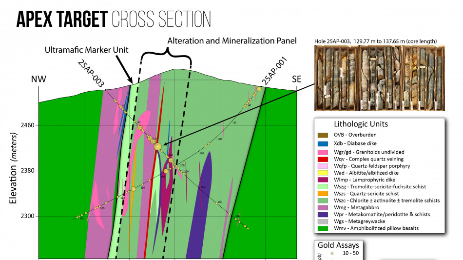 Figure 2. Cross-section illustrating broad mineralization and alteration panel at Apex marked by hydrothermal alteration, gold mineralization, and pathfinder element geochemistry. Upper right photo: Hole 25AP-003 Lower contact of Apex vein zone with oxidized vein salvage containing 0.22 g/t Au and 0.19% Cu over 0.43m core length at 135.74m hole depth. This zone was cut where the strike and dip projection extends from the surface high-grade exposures at Apex, confirming a broad mineralizing shear corridor at Apex with the ability to carry high-grade gold.
