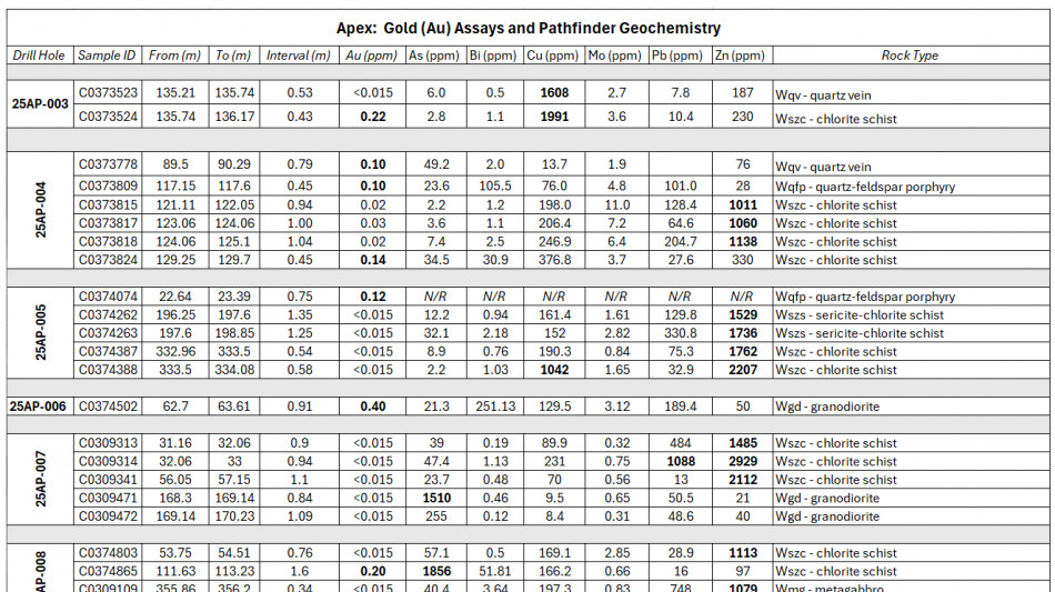 0.22 g/t Au and 0.19% Cu over 0.43 m in hole 25AP‑003 from 135.74 m to 136.17 m, adjacent to a >3 m quartz vein. This zone was cut where the strike and dip projection extends from the surface high-grade exposures, confirming a broad mineralizing shear corridor at Apex with the ability to carry high-grade gold (see Figures 1 and 2).