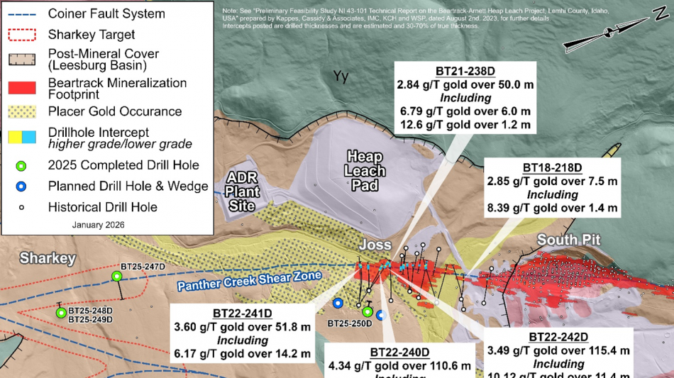 Results from the three holes completed at Sharkey, showed bedrock was deeper than indicated by the geophysics and historic RC drill hole logging. The target stratigraphy (Proterozoic metasediments) was intercepted in one hole and was highly fractured and contained small vein selvages with sericitic alteration typically seen adjacent to mineralization in other areas associated with the PCSZ. While no Joss-like mineralization was intercepted, Hole BT25-247D intercepted alteration (quartz, pyrite, arsenopyrite, sericite) and shearing near the bedrock-overburden contact.