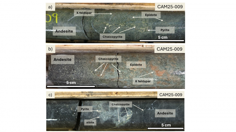 Overall, drilling of CAM25-009 encountered intermediate volcanic rocks cut by 0.5 to 8.0 m wide monzonite and diorite dikes with ubiquitous, moderate intensity, epidote-magnetite-chlorite-K-feldspar alteration interpreted as a calc-potassic assemblage. Altered rocks host are cut by 1-5 mm wide quartz veins that locally show albite halos.