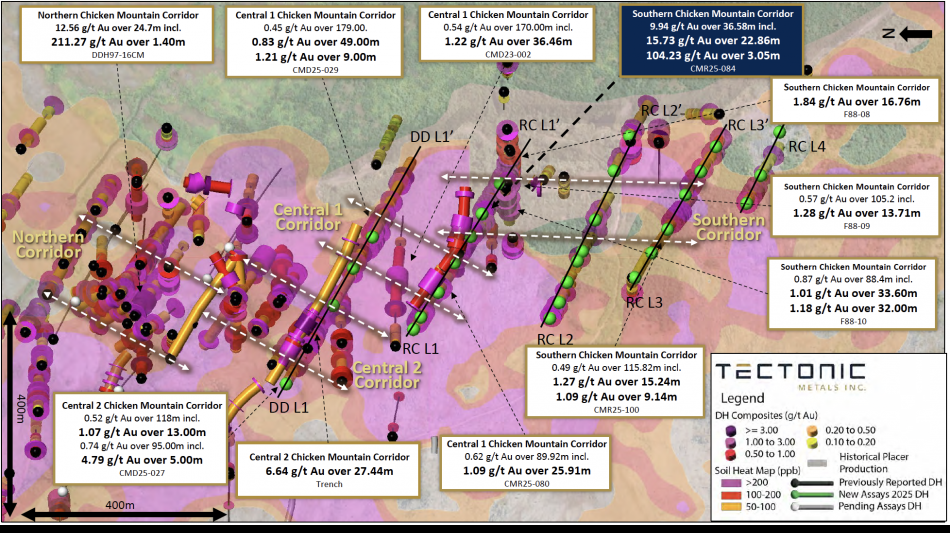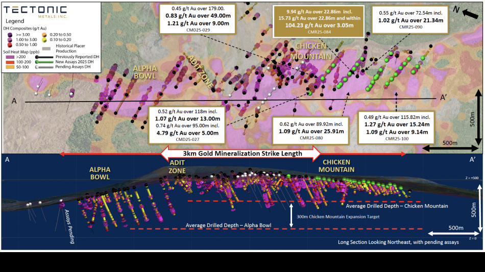 VANCOUVER, BC / ACCESS Newswire / January 22, 2026 / Tectonic Metals Inc. ("Tectonic" or the "Company") (TSXV:TECT)(OTCQB:TETOF) today announced additional drill assay results from the Company's flagship 99,800-acre Flat Gold Project in Southwest Alaska. Results are highlighted by a 364 gram-metre intercept at Chicken Mountain returning 9.94 g/t Au over 36.58 m, including 15.73 g/t Au over 22.86 m, with a bonanza-grade interval of 104.23 g/t Au over 3.05 m (hole CMR25-084), see Figure 1. The hole ended in mineralization at 54.86 m, indicating strong down-dip and along-strike expansion potential.