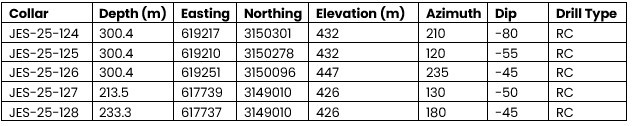 A particularly important control is the silicified andesitic dike in JES‑25‑124, which hosts the highest‑ranked target and represents an excellent structural corridor for follow‑up drilling.