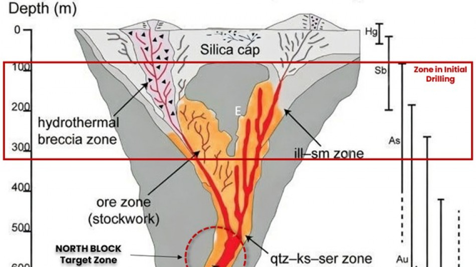 Figure 3: Schematic of an Epithermal System highlighting the location of initial drill results. After these initial results, primary target remains deeper.