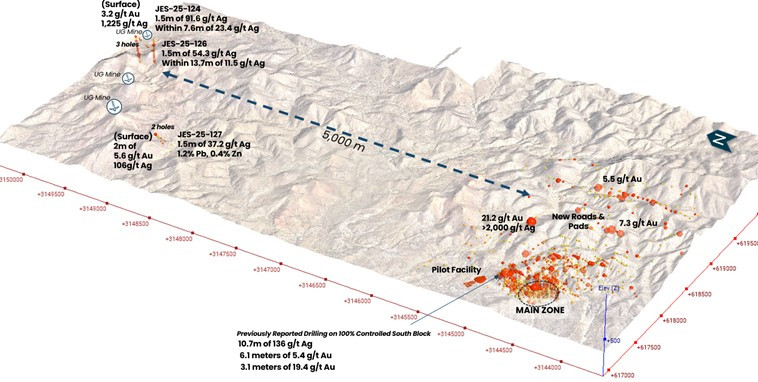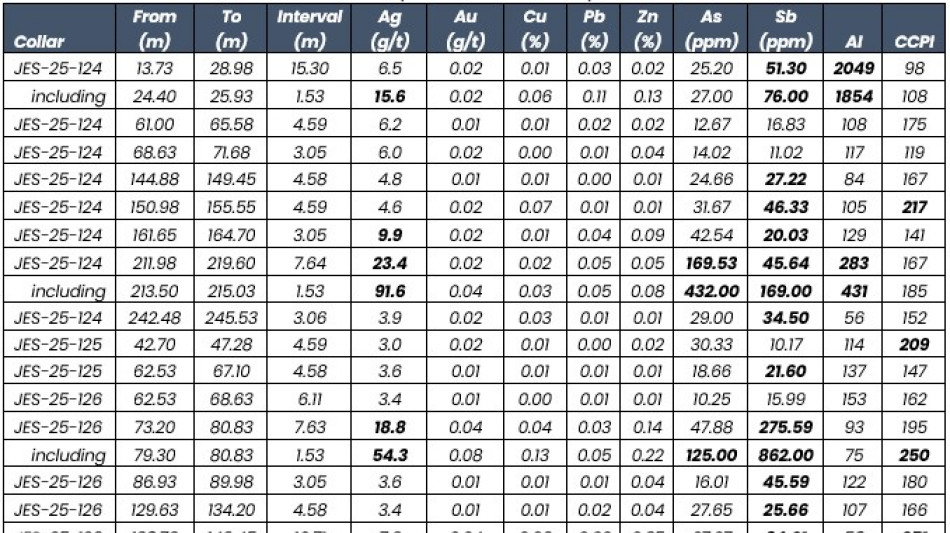 Three of five drillholes intersected greater than 1 oz/t Ag, across two targets 1.8 km apart. Multiple additional intervals delivering 3-5 m composites grading 15-20+ g/t Ag, with coincident Au, Zn, Pb, and Sb enrichments. Includes 1.5 meters of 54.3 g/t Ag (JES-25-125) and 1.5 meters of 37.2 g/t Ag, 1.2% Pb and 0.4% Zn (JES-25-127).