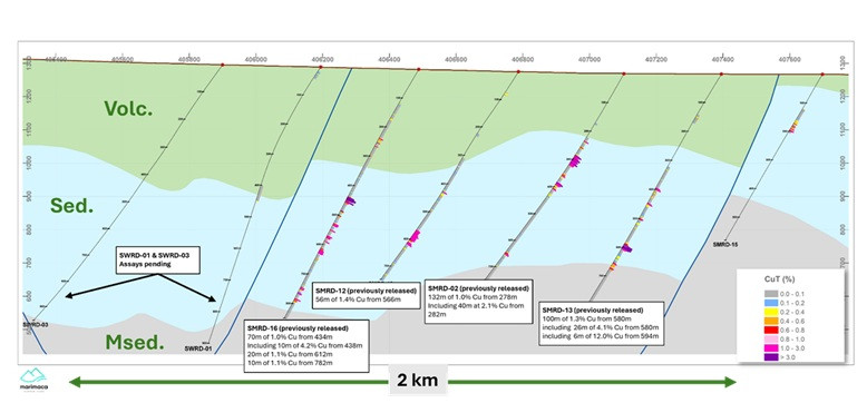 Four deep-sulphide exploration holes in the central, well defined east-west high-grade section are underway with assays pending - SWRD-01, SWRD-02, SWRD-03 and SMRD-33 (see Figure 3)