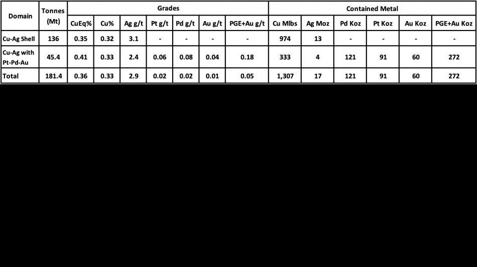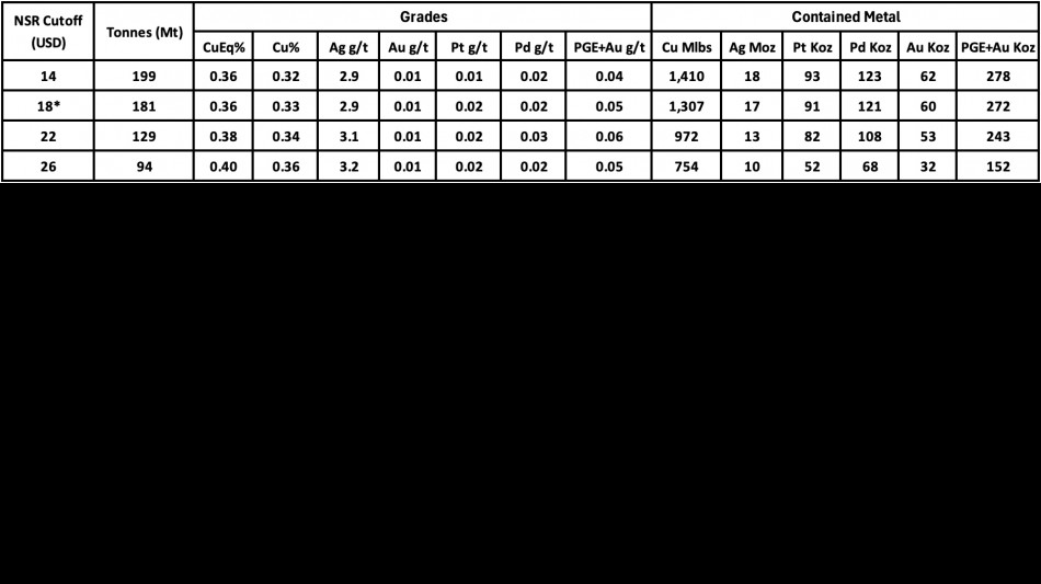 The 2026 MRE now totals 181.4 million tonnes ("Mt") at an average grade of 0.36% copper equivalent ("CuEq") (0.33% Cu and 2.9 grams per tonne ("g/t") Ag containing 1,307 million pounds ("Mlbs") of copper and 17.0 million ounces ("Moz") of silver or 1,455.1 Mlbs CuEq, constrained within a block-cave-optimized underground mining shape. The updated resource includes a 45.4 Mt subset containing 91,000 oz of platinum, 121,000 oz of palladium, and 60,000 oz of gold totalling 272,000 ounces of platinum group elements plus gold ("PGE+Au") grading 0.18 g/t PGE+Au (0.06 g/t Pt, 0.08 g/t Pd and 0.04 g/t Au). The resource is estimated using an NSR cut-off of US$18/t (See Notes to Table 1).