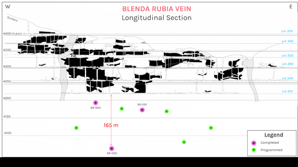 The current drill program specifically targets the depth continuation of the Blenda Rubia vein system below Level 210, representing the first modern drilling campaign designed to evaluate the vertical extent of mineralization beneath historic mine workings (Figure 01).