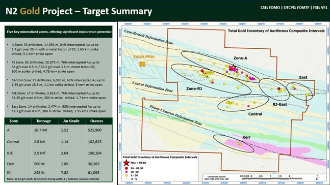N2 features six mineralized zones, each open for expansion along strike and at depth. Key targets include the "A" zone, where only ~35% of the strike has been drilled (>3.1 km open), and the "RJ" zone, which hosts historical high-grade intercepts as high as 51 g/t Au over 0.8 metres.