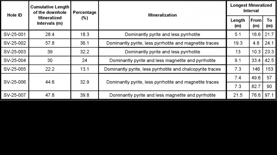 Drill holes SV-25-002, SV-25-007, SV-25-006 and SV-25-003 intercepted the longest cumulative mineralization intervals: