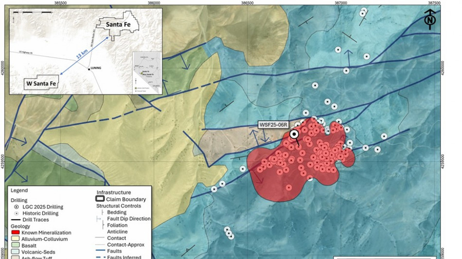 Drill hole location map for WSF25-06R, West Santa Fe Project, Nevada. The surface projection of known mineralization based on historic drilling is shown in red. Proximity to the Santa Fe Mine project is highlighted by the inset map.