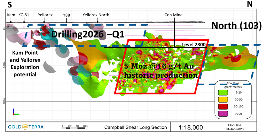 Chairman and CEO, Gerald Panneton, commented, "Our winter drilling program is progressing well with the objective to add additional ounces to our current mineral resource estimates. The drilling on the Yellorex is targeting areas where there was room to add ounces with not enough drilling, and to increase the number of ounces in the indicated category. With two (2) drill rigs coring on the Con Mine Option, our program is advancing well with more than 2600 metres to date. Gold Terra's 100% land tenure covers more than 70 kilometres of strike length of the past-producing high-grade Campbell Shear in one of Canada's largest historic gold belts."