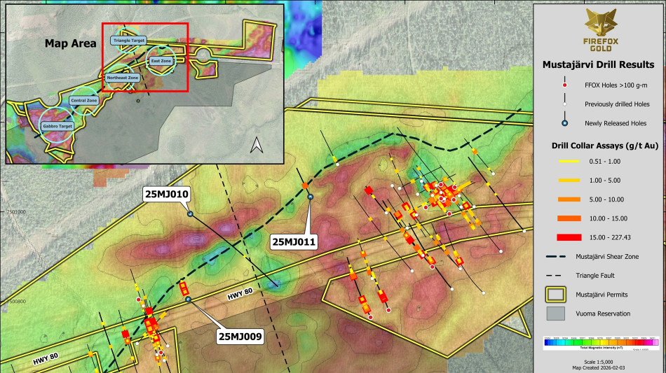 SODANKYLÄ, FINLAND / ACCESS Newswire / February 9, 2026 / FireFox Gold Corp. (TSX.V:FFOX)(OTCQB:FFOXF) ("FireFox" or the "Company") is pleased to report results from three additional holes of its 2025/26 diamond drilling program at the Company's 100%-held Mustajärvi Gold Project ("Mustajärvi"or the "Project") in Lapland, Finland. These holes generally come from the north side of the Northeast and East Zones. Drill hole 25MJ009 stepped out almost 100 metres from the high-grade intercepts at the Northeast Zone (NEZ) to test for continuation along the shear zone (see Figure 1). The hole intersected several high-grade gold-mineralized intervals, including: