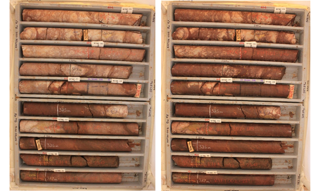 Figure 2. Drill core from RIFT26-002 showing carbonatite interval from 322.1 to 327.4 m.