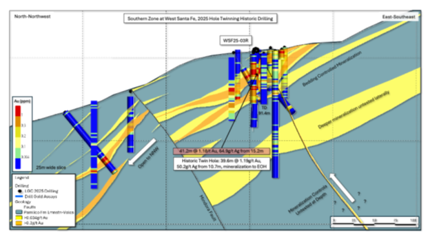 Individual intercepts in WSF25-03R contain up to 12.88 g/t Au Eq, corresponding to an east-west trending fault structure that controls higher grade precious metal mineralization in this portion of the West Santa Fe hydrothermal system (1.52m, 44.20 - 45.72m; 11.30 g/t Au, 135.0 g/t Ag).