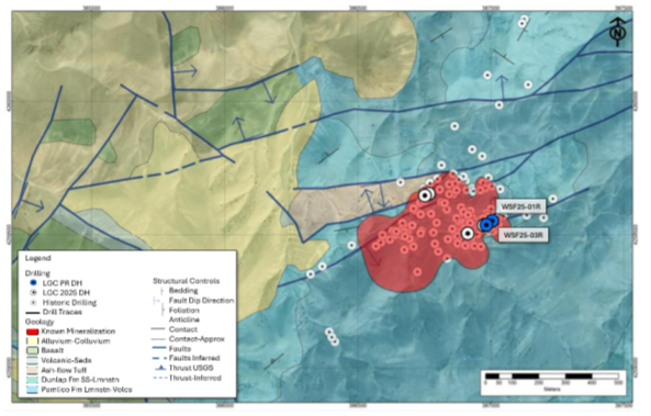 WSF25-01R: 6.1 metres (38.1 - 44.2m) grading 1.53 g/t Au Eq. The drill hole targeted structure on the very east end of the south mineralized zone, successfully intercepting key fault-controlled precious metal mineralization. The system remains open to the east, an area of old underground workings and anomalous surface geochemistry (please see plan map below).