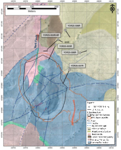 The Company has also received analytical results for the final five RC drill holes completed at the York deposit, part of the Company's Santa Fe Mine project. Two of the drill holes were lost in a fault zone and therefore abandoned due to difficult drilling conditions (YOR25-003R and -006R), while two of the remaining three holes specifically targeted the margins of the York system for use in mine planning and to determine the potential margins of a future open pit (YOR25-005R and -008R, please see below).