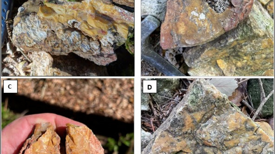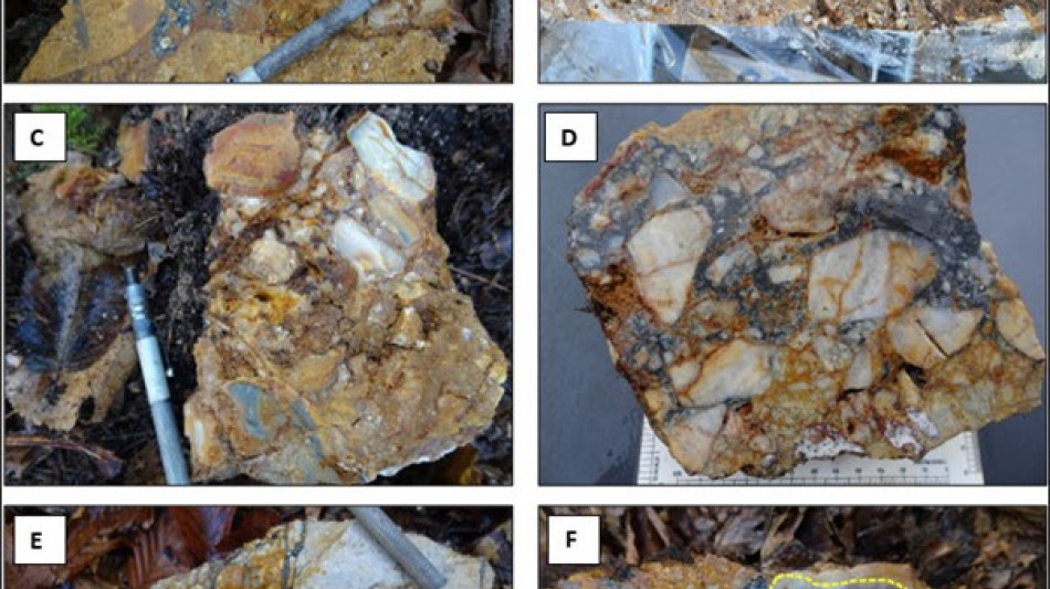 Surface rocks are typically composed of hydrothermal breccias, often containing fragments of epithermal quartz veins dislodged from deeper sections of the vein system. In adjacent areas at slightly lower elevations, there is a notable presence of quartz vein boulders and rocks exhibiting well-developed crustiform-colloform textures. The extensive degree of brecciation observed in the surface rocks indicates that the Kopernica Vein System may possess the conditions necessary for a high fluid-flux hydrothermal environment, which generally results from frequent and violent boiling events. In epithermal quartz-adularia vein systems, such boiling processes are widely regarded as the most effective mechanism for the formation of bonanza-grade gold veins.