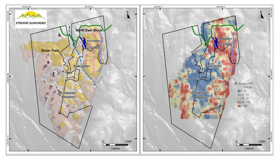 Historic soil sampling has outlined a significant, +7km long, paleo-geothermal system as defined by arsenic and antimony geochemistry (see Figures 10 & 11). Historic and the Company's rock chip sampling, which is biased to the North East Block, has shown that surface gold grades increase in value toward lower elevations, which is in line with the Company's current geological model. Historic exploration drilling, which is also restricted to the North East Block, has shown that there are strongly anomalous gold grades within the rhyolite flow dome complexes and their pyroclastic products on either flank of the North East Block which is centred on the Čertov vrch peak (748mRL), see Figure 12.