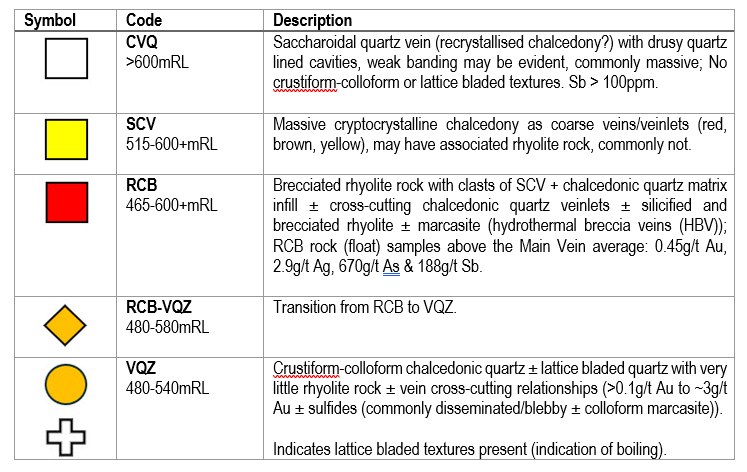 The objective of the late 2025 exploration programme was to establish where these chalcedonic quartz boulders had originated. The approach taken by the BULGOLD exploration team was to undertake a series of geological traverses commencing at the highest point of the ridgeline and then effectively walking along the contours and then dropping down to the next contour and repeating the exercise. All surface rock float (± outcrop) material was assessed during these traverses which led to the development of the mapping and prospecting framework that is shown in Table 1, and which has become an integral part of the BULGOLD exploration 'toolkit' when exploring the North East Block for epithermal quartz veins. Figure 1 shows the distribution of hydrothermally altered rocks across the Kopernica Vein System according to this framework.