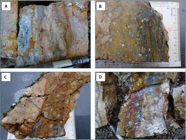 The extensive degree of brecciation observed in the surface rocks, particularly above the Main Vein, indicates that the Kopernica Vein System may possess the conditions necessary for a high fluid-flux hydrothermal environment, which generally results from frequent and violent boiling events. In epithermal quartz-adularia vein systems, such boiling processes are widely regarded as the most effective mechanism for the formation of bonanza-grade gold veins.