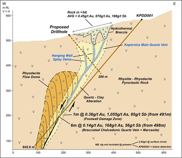 Surface mapping, drilling and rock sampling indicate that the Main Vein's gold potential spans a 250-300 metre vertical range between the 550mRL (average surface rock sample: 0.45g/t Au, 2.9g/t Ag, 670g/t As, 188g/t Sb) and the KPDD001 drill intercept at 200mRL.