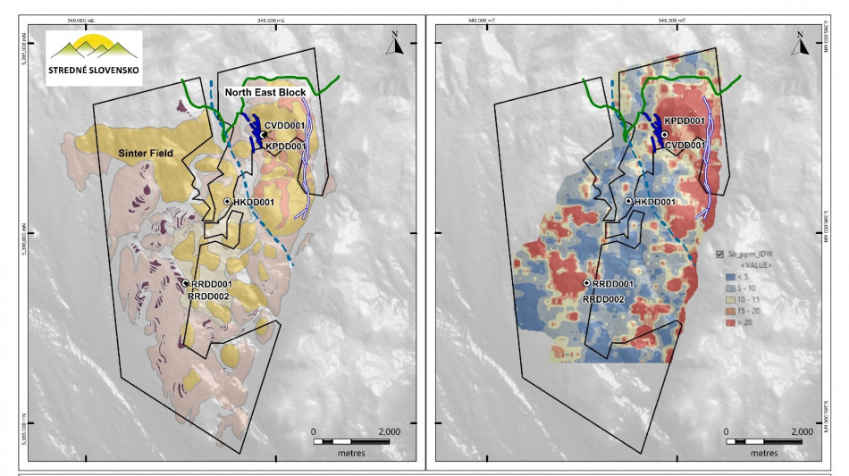 Additionally, approximately 600m to the north-west of the Main Vein an outcrop of hydrothermal breccia was identified in a small creek which assayed 0.55g/t Au and 200g/t Sb. Abundant hydrothermally altered float rock has been identified within this area directly beneath the andesite rock contact that continues north to host the Kremnica gold deposit. More exploration is required in this area to determine the potential for additional quartz veins.