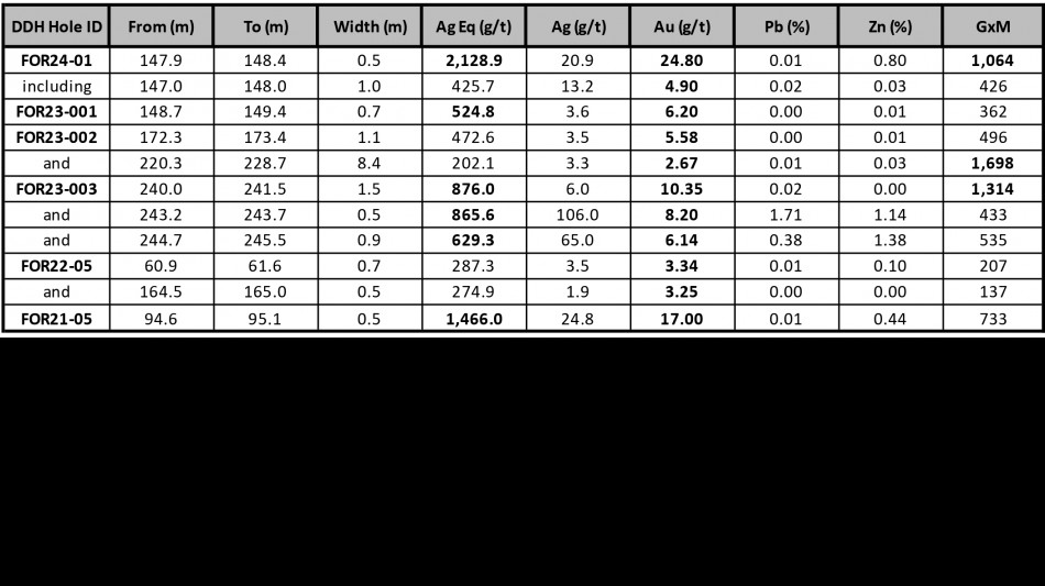 Impressive past drill results: FOR23-03 returned 46.1 m grading 249.6 g/t Ag Eq (99.1 g/t Ag, 0.52 g/t Au, 0.65% Pb, and 2.62% Zn), for a grade thickness of 11,494 gram-meter ("GxM"), with multiple internal higher-grade zones including 3.3 m of 1,413 g/t Ag Eq (562.4 g/t Ag, 0.20 g/t Au, 2.35% Pb and 20.3% Zn) (see Table 1).