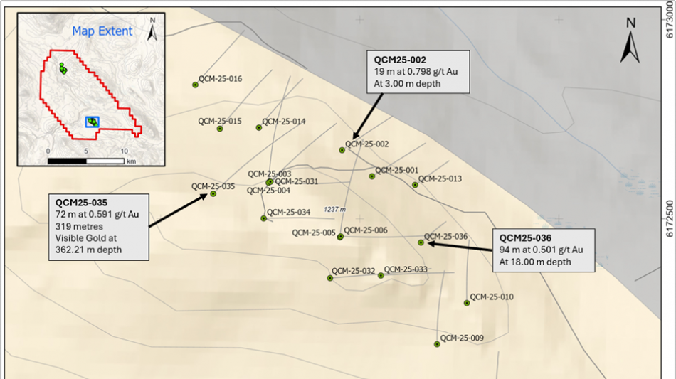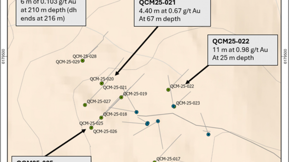 Diamond drill holes QCM-25-018 to 019 returned assay results of up to 25 metres of 0.632 g/t Au from 91.00 metres depth and 17.69 metres of 0.631 from 156 metres depth. Drill hole QCM-25-018 returned four metres of 1.628 g/t Au at 165 metres depth, near to end of this hole at 175 m.