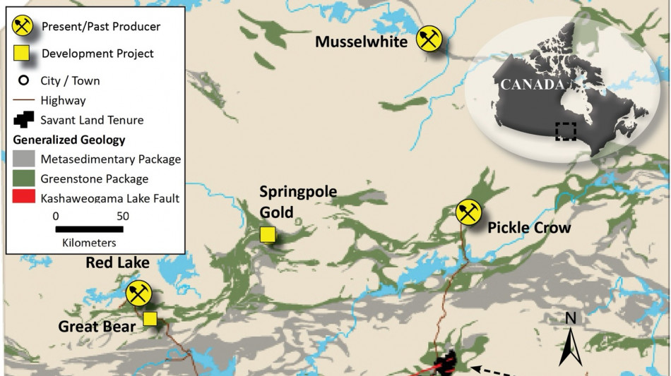 The Savant Project is a district-scale (1,178 contiguous claims over 24,197.5 hectares) gold exploration property located in the Canadian Shield, within the western Wabigoon Greenstone belt, with a good plumbing system and large 40-km long regional structure, the Kashaweogama Lake Fault Zone (and the eastern extension referred to as the Wiggle Creek Deformation Zone, "WDZ"), which bisects the claim block, along with extensive, intensely folded, banded iron formations (BIF) cut by numerous major and secondary shear zones. There are numerous large mines and deposits in the region, including Musselwhite with current proven and probable mineral reserves of 1.5 million ounces ("Moz") at 6.43 g/t Au, (see Orla Mining Reserves & Resources); Red Lake with current proven and probable mineral reserves of 2.0 Moz at 4.20 g/t Au (see Evolution Mining Reserves & Resources), and Pickle Crow with current inferred mineral resources of 2.8 Moz at 7.2 g/t Au (see, Fire Fly Metals Mineral Resources).