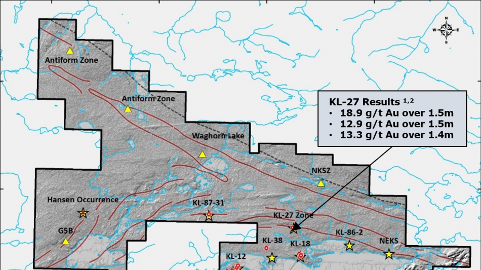 Exploration efforts will focus on the KL-12 and KL-27 showings, where historical assays have recorded 16.2g/t Au over 2.0m¹,² and 18.9g/t Au over 1.5m¹,², respectively. Ground geophysical surveys, soil sampling, prospecting, and geological mapping are planned to define and prioritize targets in advance of a drilling program scheduled in the third quarter of 2026.