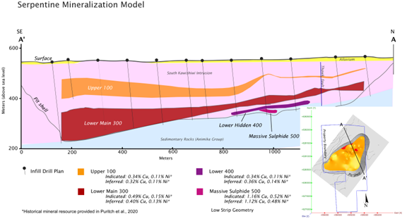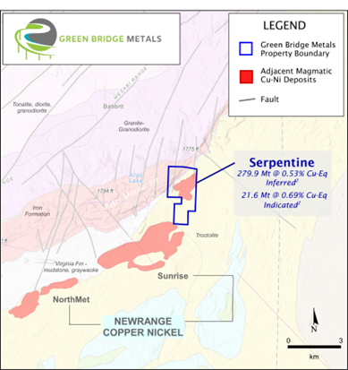 Serpentine is a large, open-pit style copper-nickel sulphide system in the Duluth Complex, located immediately adjacent to the NewRange Copper Nickel's ("NewRange") NorthMet and Sunrise deposits (Figure 2). The Company believes Serpentine's scale, grade, geometry and strategic location make it one of the most compelling copper and other critical minerals development opportunities in the Duluth Complex, particularly with copper and nickel prices at or near multi-year highs. Serpentine hosts an Inferred Mineral Resource Estimate ("MRE") of 279.9 million tonnes at 0.37% Cu, 0.12% Ni, and 0.007% Co (0.53% CuEq), with an additional Indicated 21.6 million tonnes at 0.46% Cu and 0.16% Ni (0.69% CuEq), as disclosed in the Company's NI 43-101 Technical Report ("Technical Report") dated July 14, 2025, a copy of which may be obtained under the Company's profile at www.sedarplus.ca1.
