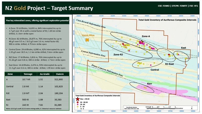 Formation Metals Inc. is a North American mineral acquisition and exploration company focused on the development of quality properties that are drill-ready with high-upside and expansion potential. Formation's flagship asset is the N2 Gold Project, an advanced gold project with a global historic resource of ~871,000 ounces (18 Mt grading 1.4 g/t Au (~810,000 oz Au) across four zones (A, East, RJ-East, and Central)2,3 and 243 Kt grading 7.82 g/t Au (~61,000 oz Au) across the RJ zone2,4) and six mineralized zones, each open for expansion along strike and at depth including the "A" zone, of which only ~35% of strike has been drilled (>3.1 km open), and the "RJ" zone, host to historical high-grade intercepts as high as 51 g/t Au over 0.8 metres.