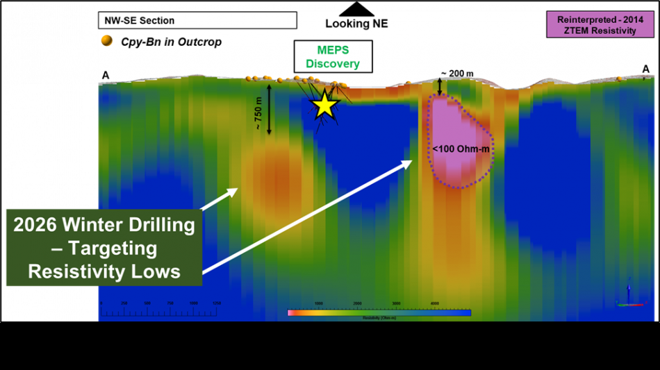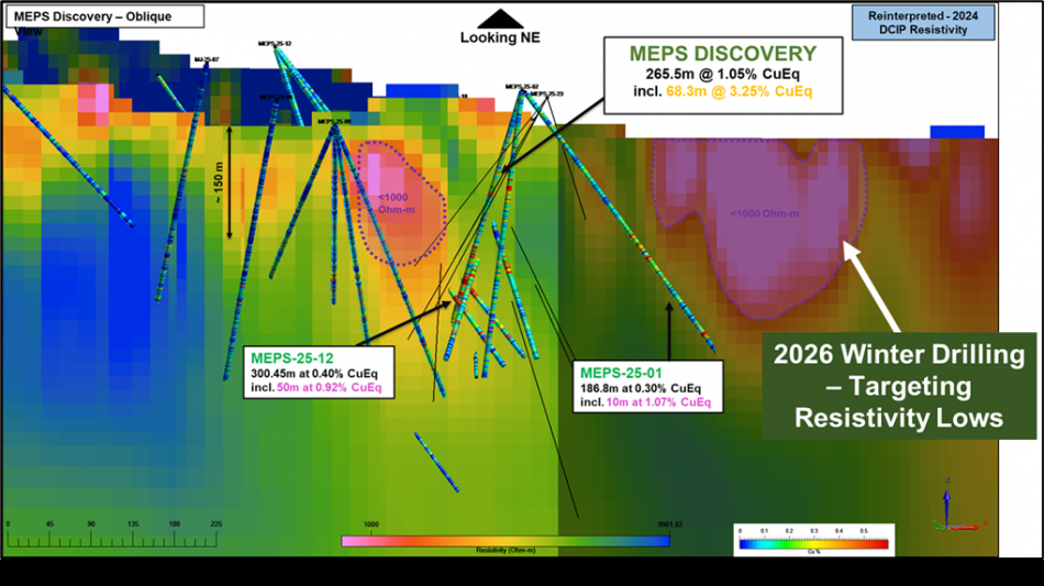 The 2026 drill program will focus on systematically delineating the scale of the MEPS Discovery area and evaluating additional targets generated from surface copper occurrences and geophysical data. Recent drilling has demonstrated a strong correlation between resistivity lows, favourable structural trends and copper mineralization which has been reinforced through physical property testing in drill core. The relative scale of the resistivity low associated with the MEPS Discovery and the resistivity lows associated with 2026 targets shows potential for a much larger system than what was delineated in 2025.