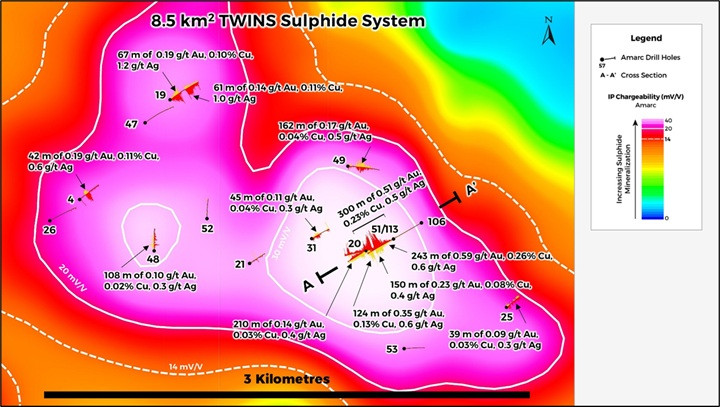 TWINS is located on the 10 km long PINE Porphyry Trend, which also includes the PINE Deposit and the CANYON Discovery (Figure 1). The highly prospective TWINS porphyry target sulphide system is defined by an 8.5 km 2 Induced Polarization ("IP") chargeability geophysical anomaly. The large footprint of this lithocap target, its extensive veneer of glacial overburden cover, the highly anomalous Au intercepts from very widely spaced and relatively shallow reconnaissance drill holes previously released by Amarc, and the 2025 results, highlight the significant exploration potential for discovery of another porphyry Cu-Au deposit (Figure 2, see Amarc releases March 2, 2023 and February 28, 2025).
