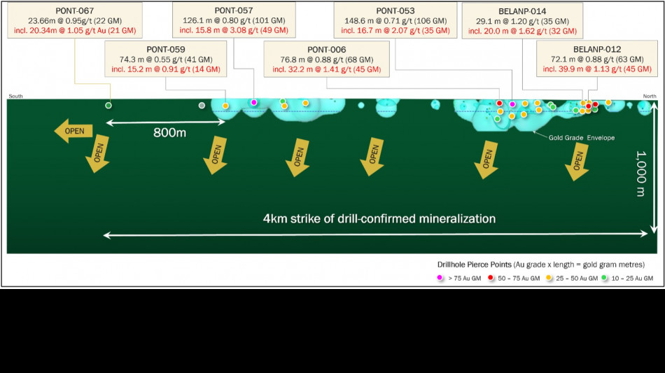PONT067: 20.34m @ 1.05 g/t Au (a significant 800m step-out to the south, extending the total strike to 4km).
