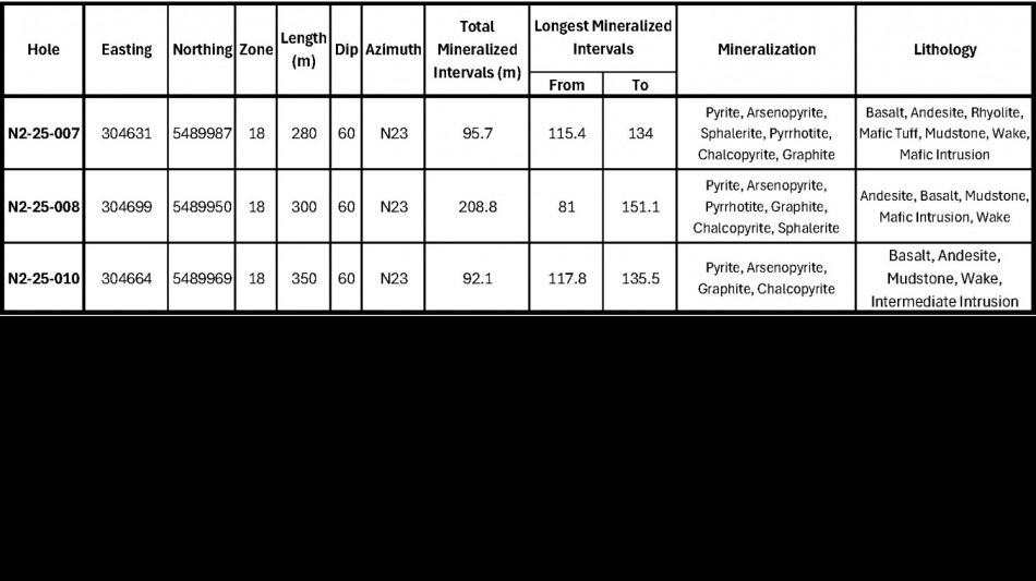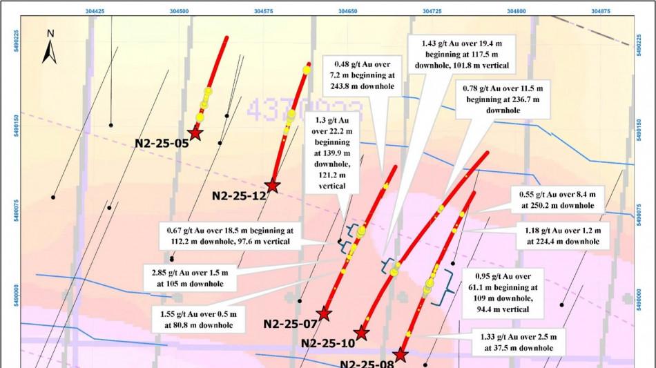 N2-25-008: 0.95 g/t Au over 61.1 metres beginning at 109 metres downhole, 94.4 metres vertical. Highlight interval includes 1.68 g/t Au over 26.5 metres.