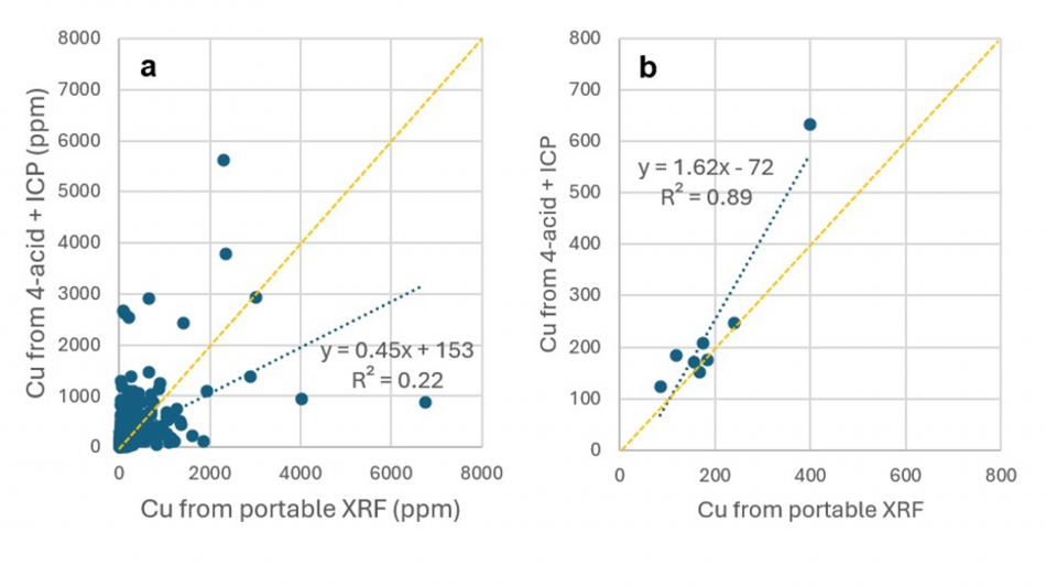 Figure 3: X-Y plots comparing pXRF and wet chemistry (4-acid digest, ICP finish) analyses for (a) all individual samples and (b) average copper abundances of each drill hole. Note that no pXRF data was collected for drill holes CAM25-004 and 006. Orange line shows a 1:1 correlation for reference.