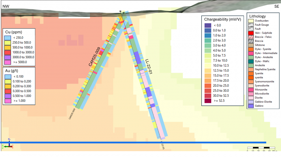 Figure 2: Cross section, looking northeast and 100 m wide, showing holes CAM25-009 and LL-22-01 over chargeability inversion image. Lithology is displayed on the center-right of the drill trace, with gold assays (g/t) to the right and copper (ppm) on the left.