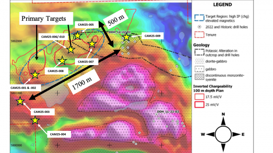 The 2025 drill program targeted historical Cu-in-soil anomalies coincident with chargeability highs as well as, in some cases, moderate to high resistivity and magnetic anomalies. Exploration targets were interpreted in the context of an alkalic porphyry model, where such coincident geophysical and geochemical features may indicate pyrite-chalcopyrite mineralization associated with magnetite-bearing potassic alteration. The target area is covered by till and had not been drilled until this 2025 program, with historical hole LL-22-01 drilled just northeast of the anomalous area.