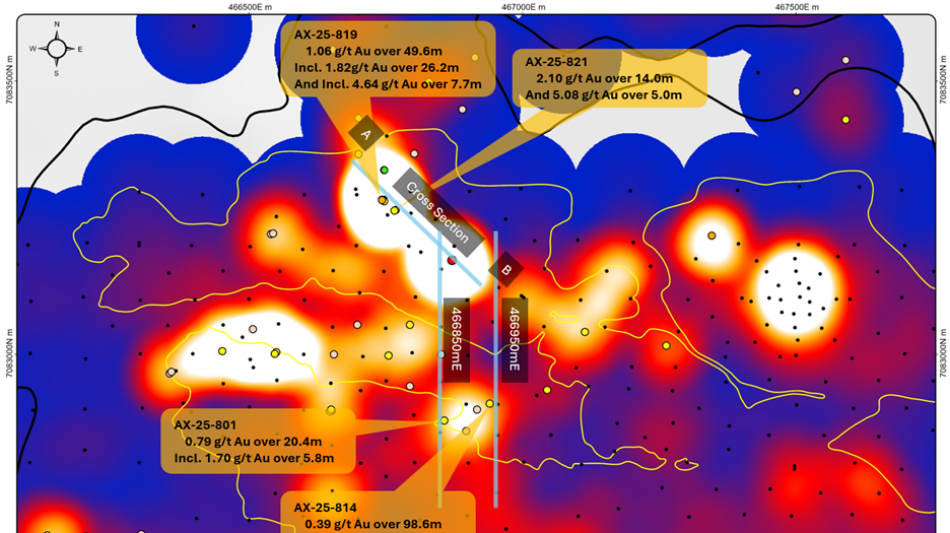 AX-25-819 - 1.82 g/t Au over 26.2m and 4.64 g/t Au over 7.7m, within 1.06 g/t Au over 49.6m; includes high-grade interval of 19.90 g/t Au over 1.5m;