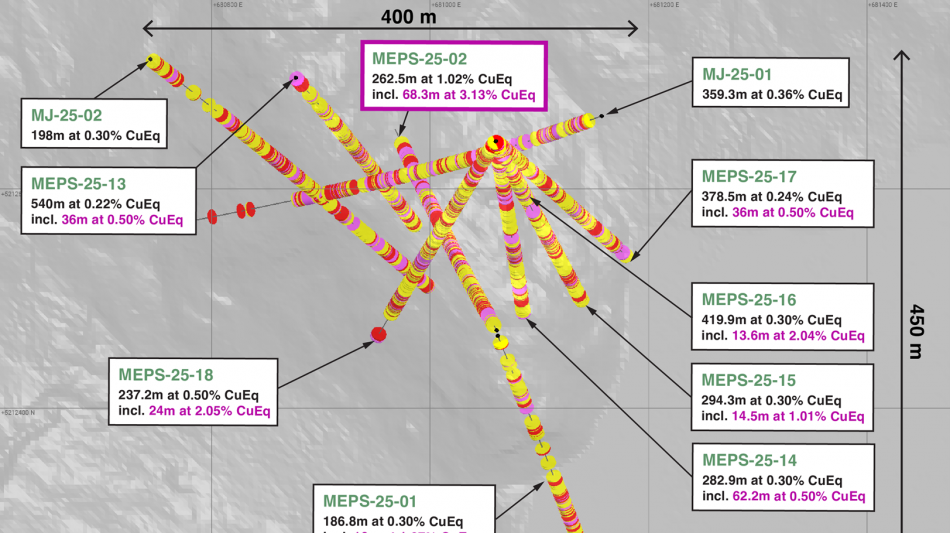 Jeremy Niemi, SVP Exploration and Development, commented, "We are very excited about these wide intervals of copper from surface and, importantly, the systematic expansion of the high-grade bornite zone by 150 metres around the discovery hole MEPS-25-02. Each step-out hole has successfully extended the zone either laterally or vertically, demonstrating strong continuity of the high-grade core within a much broader copper system. The mineralization remains open in most directions, and we are beginning to see clear structural and grade trends emerging that will guide our 2026 resource-focused drilling."