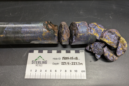 A 30m expansion of the high-grade bornite zone in MEPS-25-18, highlighted by the highest-grade individual copper sample intersected to date of 38.9% Cu over 0.3m in MEPS-25-18 at 227.4m (see Figure 2) that is included within a high grade bornite-rich interval grading 24m of 2.05% CuEq and also within a broader 237.2m interval grading 0.5% CuEq.