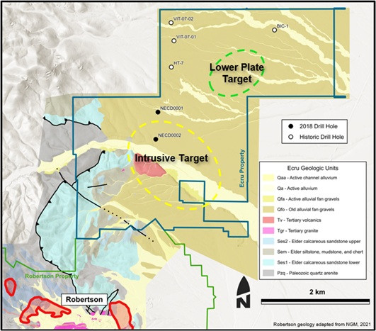 A potential Carlin-type system is defined by an untested, prominent gravity high target interpreted to be a region of structurally uplifted lower plate carbonates near surface, under pediment cover. Nearby historical drilling has identified anomalous gold and pathfinder geochemistry in upper plate stratigraphy which supports the potential for a mineralized, lower plate carbonate window at Ecru.