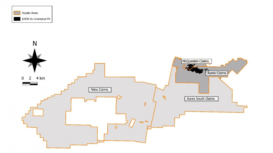 Further to public documents filed in the Ontario court on February 26, 2026, Franco-Nevada has entered into a royalty purchase agreement[1] with PricewaterhouseCoopers Inc., the receiver and manager (in such capacity, the "Receiver") for Victoria Gold Corp. ("Victoria"), to purchase the NSR covering the McQuesten and Aurex properties for $52.2 M. The McQuesten and Aurex properties consist of 92.6 square kilometers ("km2") (510 claims) out of the 720 km2 total project area for AurMac. The NSR purchased by Franco-Nevada applies to an area which includes the existing Resource and is shown in Figure 1. The area represents approximately 13% of the total AurMac project area.